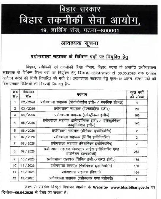 The Bihar Technical Service Commission has announced a recruitment drive for Laboratory Assistant posts in different technical and science-related fields. Through this notification, eligible candidates can apply for positions available in various disciplines under the Bihar government setup.